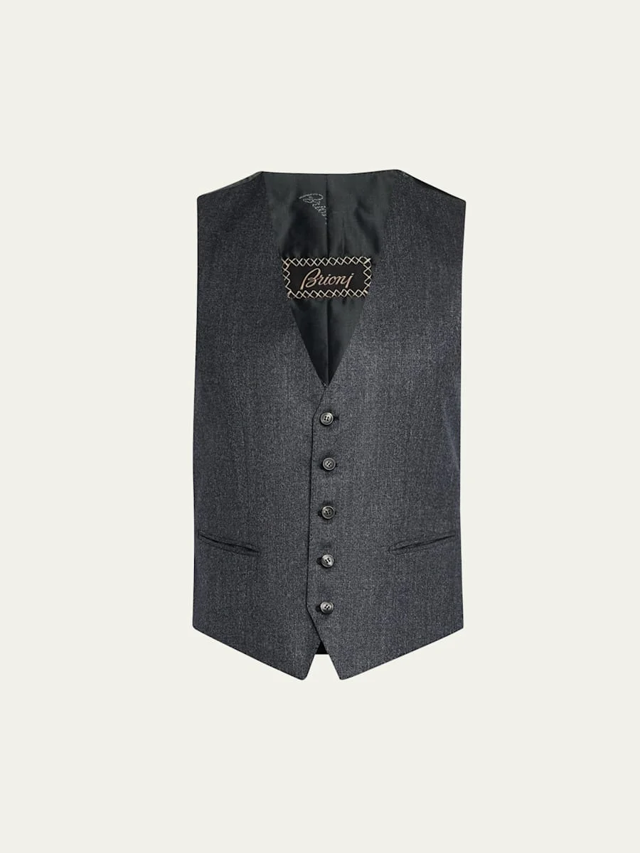 Brioni "Brun" suit separate vest V-neck Five-button closure Besom pockets Repeating logo print on back Adjustable back strap Sleeveless Wool/cashmere Made in Italy Model is 6'1"/185cm. Online Inquiries: BGS21_NC9KV| Store Inquiries: #4837349