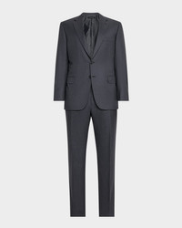 - Brioni "Essential" two-piece suit. - Notch lapel; two-button front. - Lightly padded natural shoulder. - Basted sleeves. - Welt pocket at chest. - Flap pockets at hips. - Double-vented back. - Includes matching flat-front trousers with straight leg. - Unfinished hem to be tailored to desired length. - Virgin wool; dry clean. - Handmade in Italy.