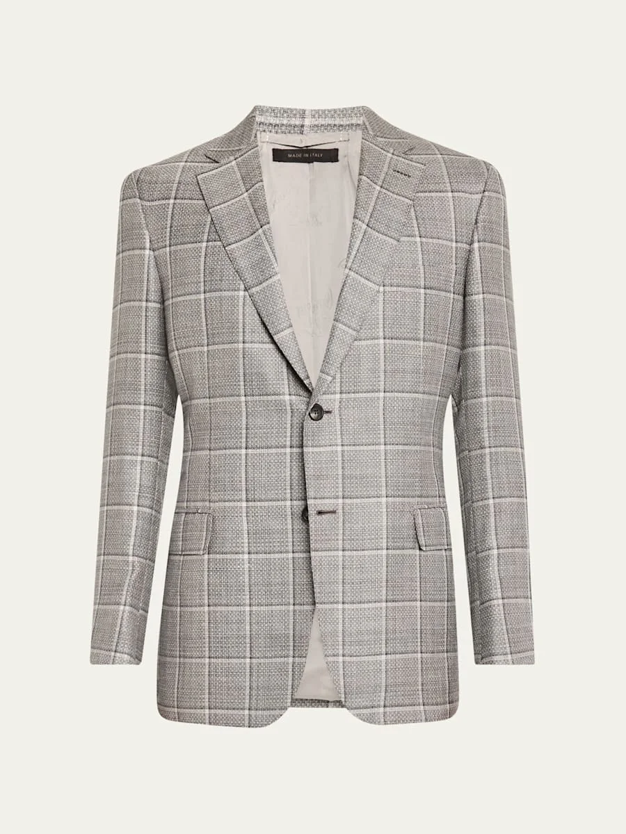 Brioni sport coat in tonal plaid Notch lapels; buttonhole at left lapel Two-button closure Chest welt pocket Hip flap pockets Unfinished sleeves Double-vented back Cashmere/silk/linen Made in Italy Online Inquiries: BGS21_NCSN8| Store Inquiries: #4943516