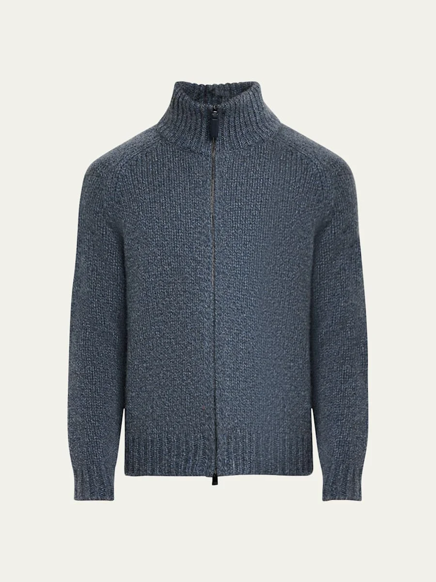 Brioni sweater in ultra-soft mouline knit Ribbed stand collar Two-way zip closure Long sleeves Cashmere Dry clean Made in Italy Model is 6'1"/185cm. Online Inquiries: BGS21_NC52Q| Store Inquiries: #4807436