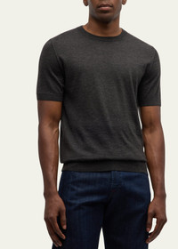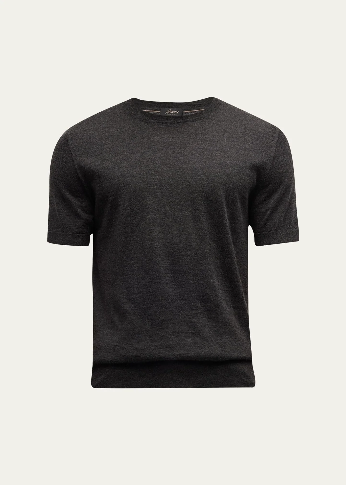 Brioni knit sweater with a subtle logo plaqué accent at the hem Crew neckline Short sleeves Ribbed cuffs and hem Pullover style Cashmere/silk Made in Italy Model is 6'1"/185cm. Online Inquiries: BGS21_N77V8| Store Inquiries: #3047513