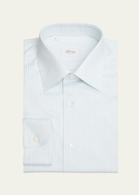 Brioni dress shirt in cotton featuring a bengal stripe print Point collar Button placket Long sleeves Round barrel cuffs Shirttail hem Cotton Made in Italy Online Inquiries: BGS21_NCSVY| Store Inquiries: #4944446