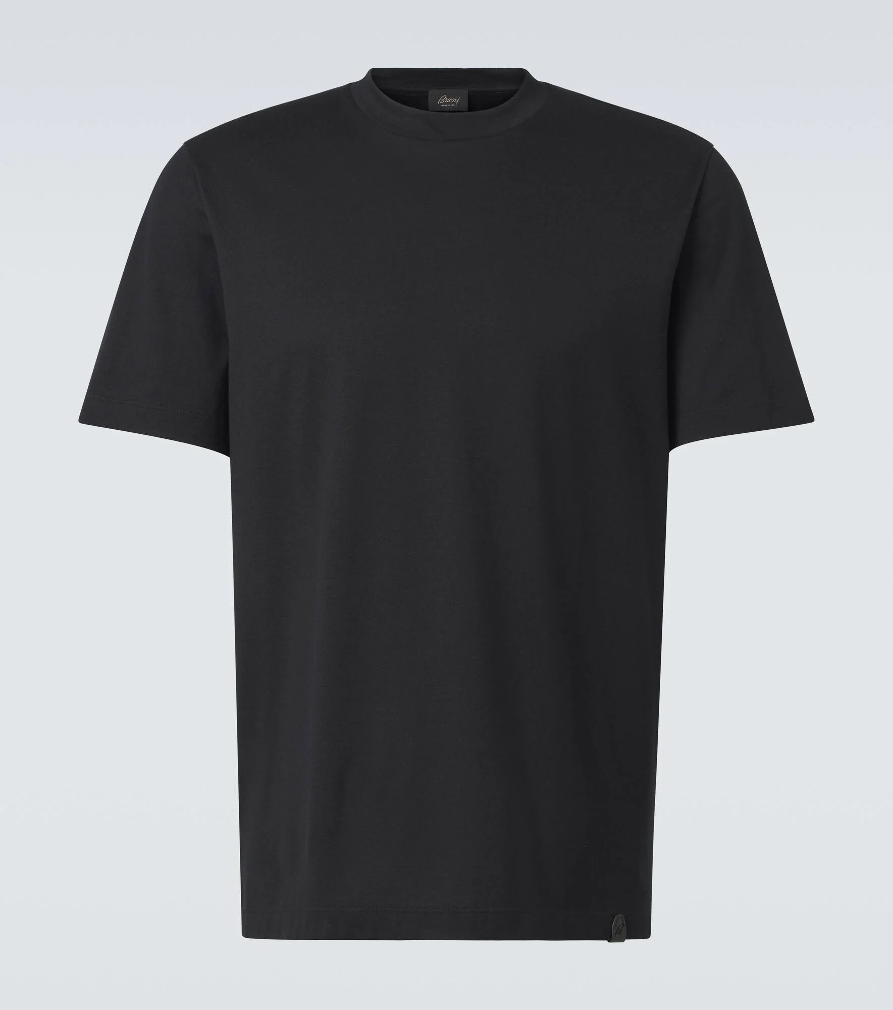 Crafted in Italy from pure, durable cotton jersey, this Brioni T-shirt is a wardrobe essential. Designed for a regular fit, this piece features a classic round crewneck and short sleeves for effortless, everyday style. Product Details - Material: 100% cotton - Care instructions: machine wash - Made in Italy - Designer color name: Black - Item color: black - Length: regular (hip-length) - Sleeves: short-sleeved - Hem: straight - Collar: crewneck - Contains non-textile parts of animal origin - Item number: P01048025 Size & Fit - True to size - Straight fit - Slightly stretchy fabric - Falls to the hip - The model in the picture is 185cm-6'1" and wearing a size L