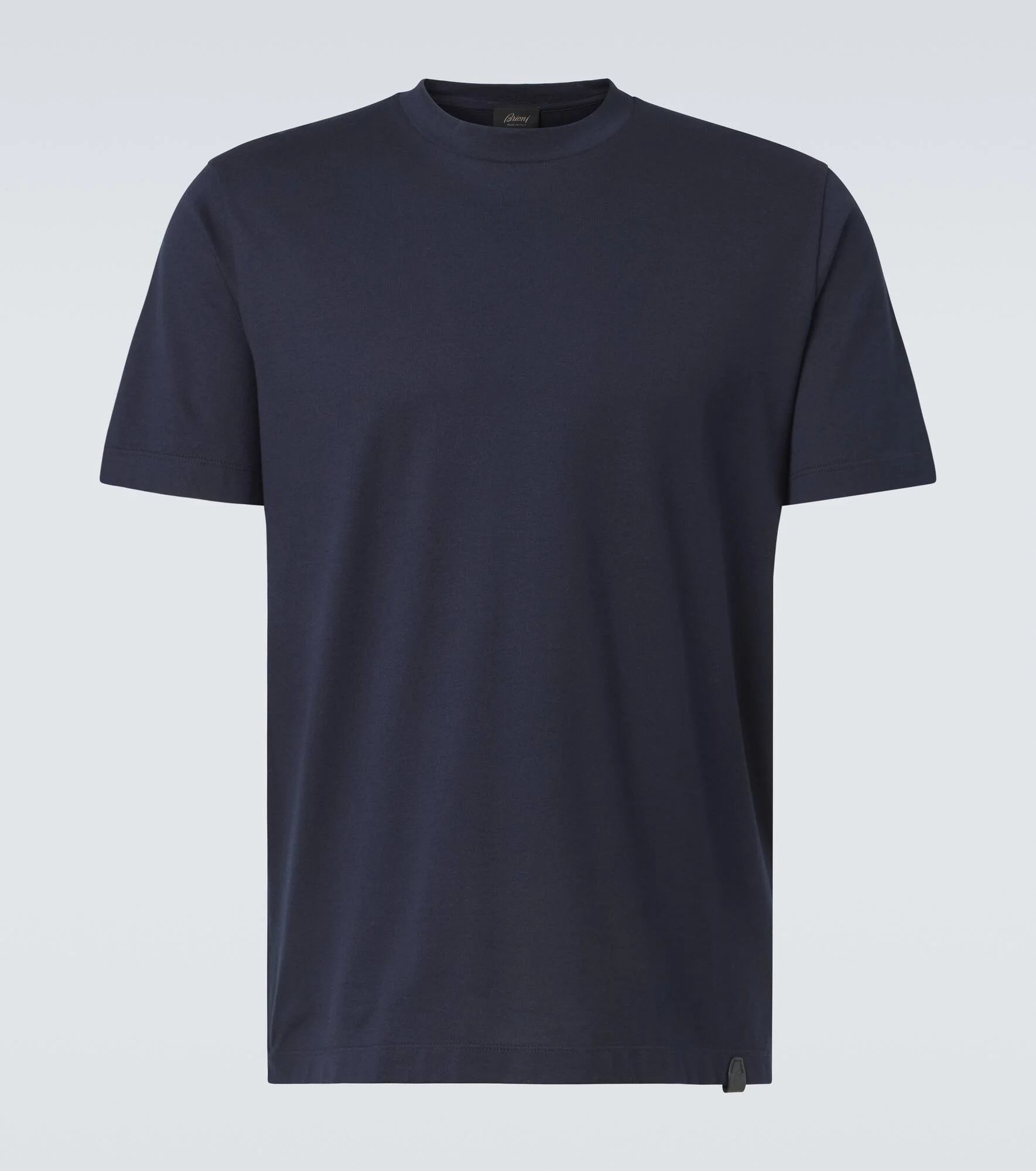 Crafted in Italy from pure, durable cotton jersey, this dark navy Brioni T-shirt is a wardrobe essential. Designed for a regular fit, this piece features a classic round crewneck and short sleeves for effortless, everyday style. Product Details - Material: 100% cotton - Care instructions: machine wash - Made in Italy - Designer color name: Navy - Item color: blue - Details: 100% leather - Sleeves: short-sleeved - Hem: straight - Collar: crewneck - Contains non-textile parts of animal origin - Item number: P01048026 Size & Fit - True to size - Straight fit - Slightly stretchy fabric - Falls to the hip - The model in the picture is 185cm-6'1" and wearing a size L