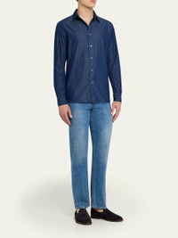 Brioni casual button-down shirt in soft cotton denim for versatile styling Spread collar Button placket Long sleeves Round barrel cuffs Back yoke Curved hem Cotton Made in Italy Online Inquiries: BGS21_NDNRX| Store Inquiries: #5055885