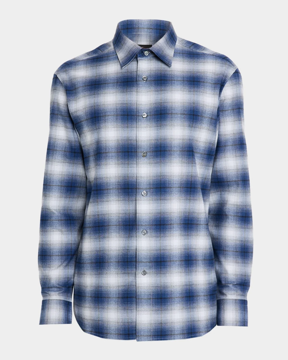 Cotton flannel is accented with a degrade check print on this premium Brioni sport shirt. Point collar Button placket Long sleeves Round barrel cuffs Shirttail hem Cotton Made in Italy