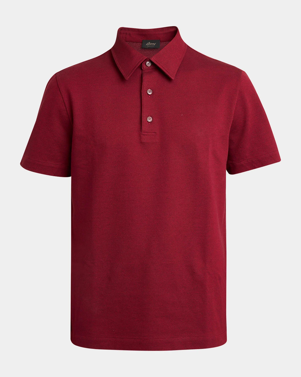 - Brioni solid polo shirt in cotton jersey - Spread collar - Three-button placket - Short sleeves - Pullover style - Cotton - Dry clean - Made in Italy - Model is 6'1"/185cm.