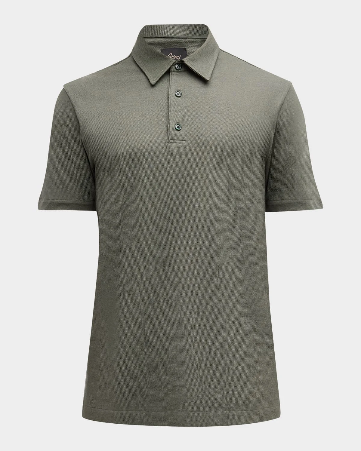 - Brioni solid polo shirt in cotton jersey - Spread collar - Three-button placket - Short sleeves - Pullover style - Cotton - Dry clean - Made in Italy - Model is 6'1"/185cm.