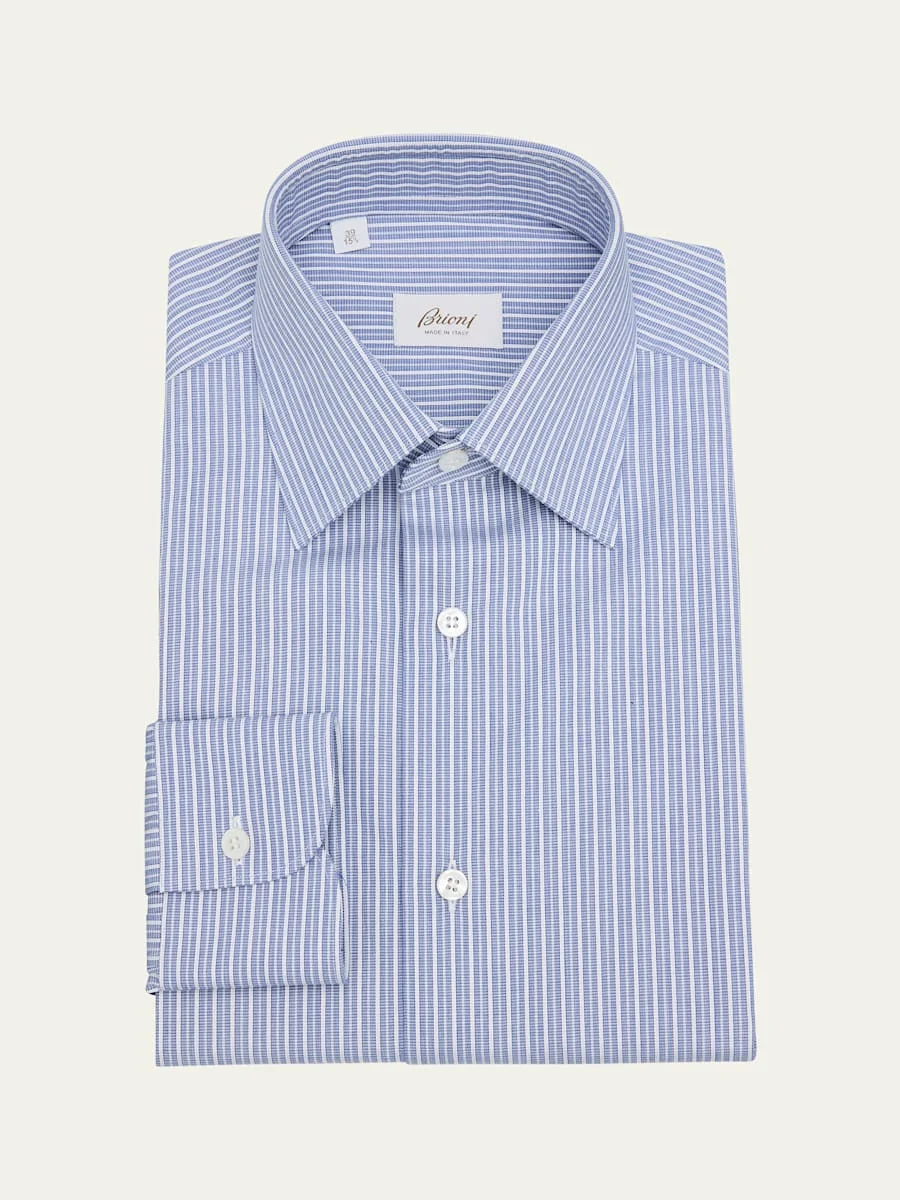 Brioni dress shirt in breathable cotton adorned with a multi-stripe pattern Point collar Button placket Long sleeves Round barrel cuffs Shirttail hem Cotton Made in Italy Online Inquiries: BGS21_NDKW2| Store Inquiries: #5042513