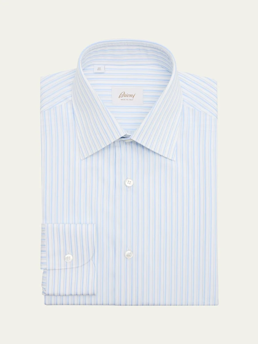 Brioni dress shirt in breathable cotton adorned with a multi-stripe print Point collar Button placket Long sleeves Round barrel cuffs Shirttail hem Cotton Made in Italy Online Inquiries: BGS21_NDKW3| Store Inquiries: #5042515