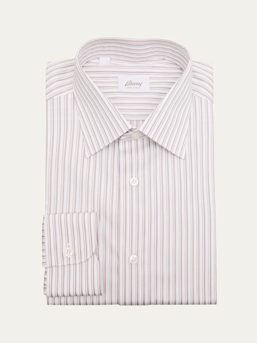 Brioni dress shirt in breathable cotton adorned with a multi-stripe print Point collar Button placket Long sleeves Round barrel cuffs Shirttail hem Cotton Made in Italy Online Inquiries: BGS21_NDNUD| Store Inquiries: #5042515