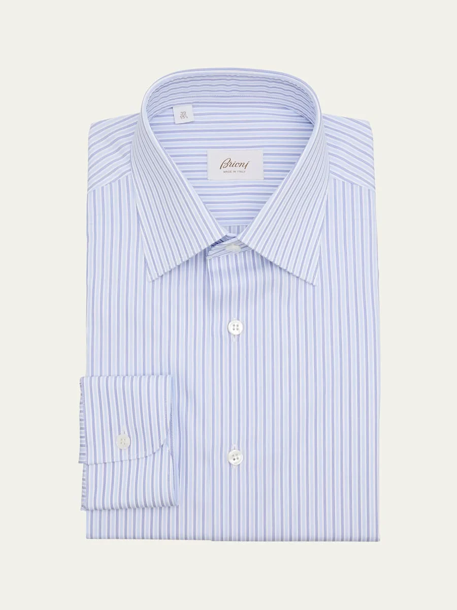 Brioni dress shirt in breathable cotton adorned with a multi-stripe print Point collar Button placket Long sleeves Round barrel cuffs Shirttail hem Cotton Made in Italy Online Inquiries: BGS21_NDKVX| Store Inquiries: #5042502