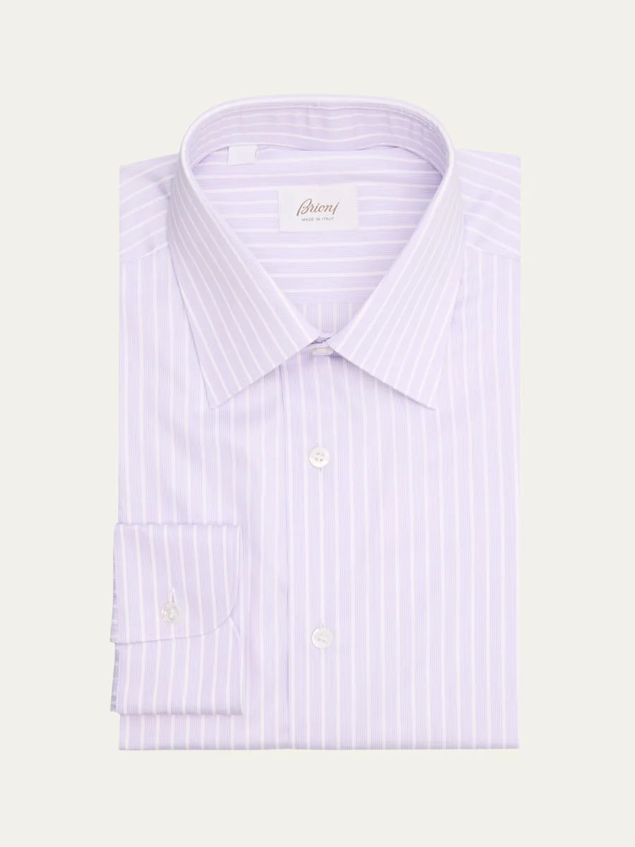 Brioni formal dress shirt in crisp cotton twill showcasing a vertical multi-stripe print Point collar Button placket Long sleeves Round barrel cuffs Shirttail hem Cotton Made in Italy Online Inquiries: BGS21_NDNPF| Store Inquiries: #5055756