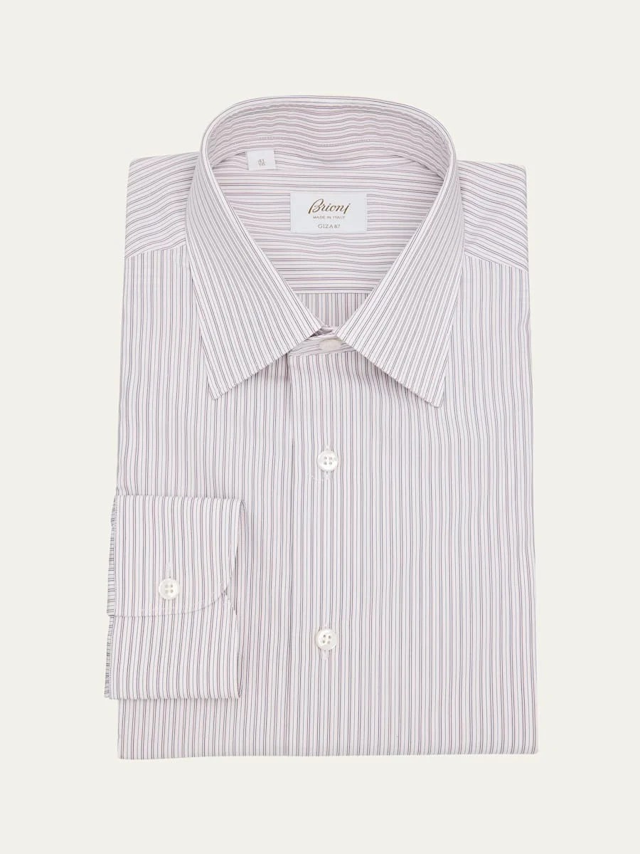 Brioni dress shirt crafted from Giza 87 cotton with a multi-stripe pattern Giza 87 is a variety of Egyptian Extra-Long Staple cotton known for its sheen, strength, and fiber length Point collar Button placket Long sleeves Round barrel cuffs Shirttail hem Cotton Made in Italy Online Inquiries: BGS21_NDKX7| Store Inquiries: #5042559