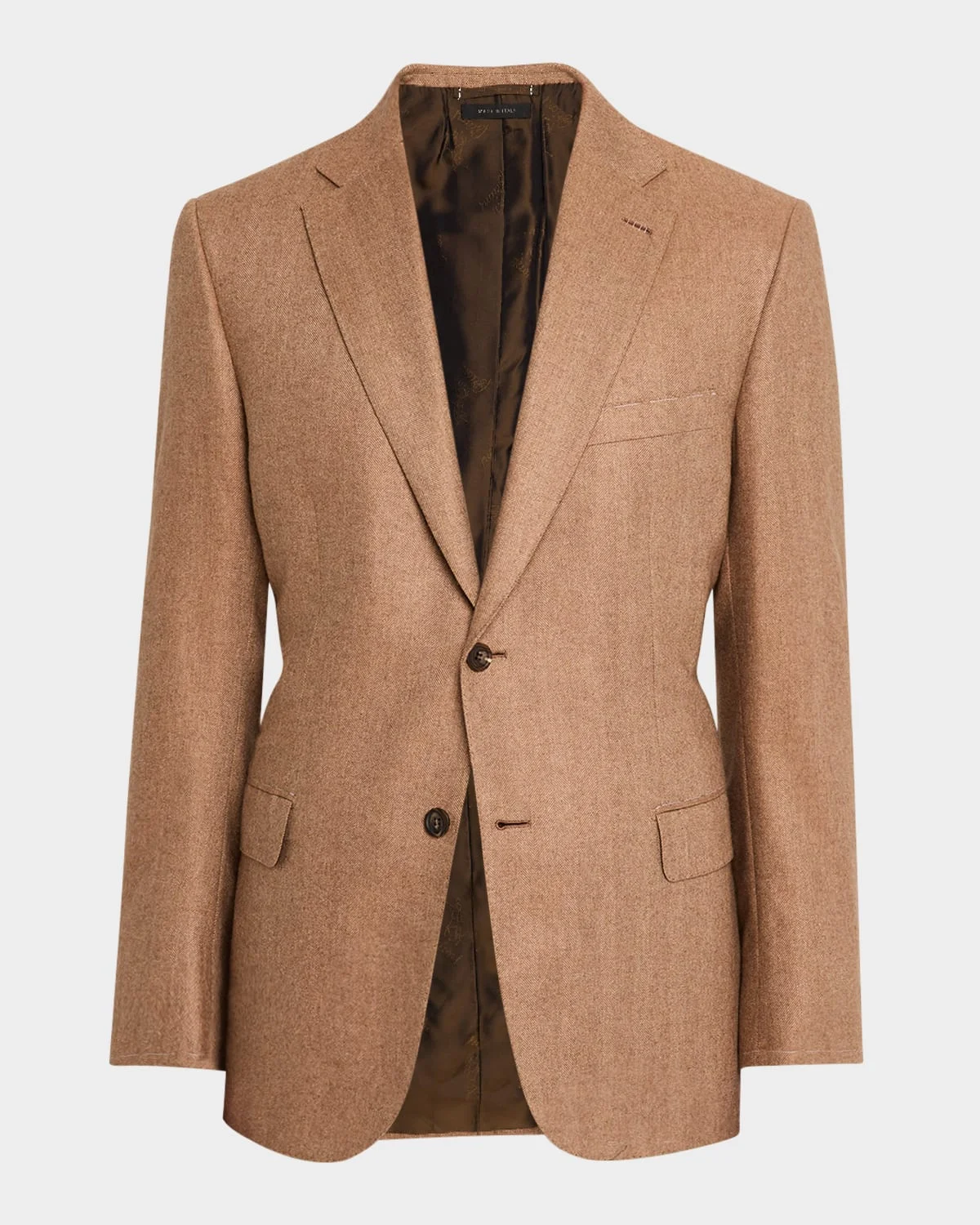 - Brioni herringbone blazer - Notched lapels - Two-button closure - Chest welt pocket - Side flap pockets - Unfinished sleeves - Double-vented back - Silk/wool - Dry clean - Made in Italy - Model is 6'1"/185cm.