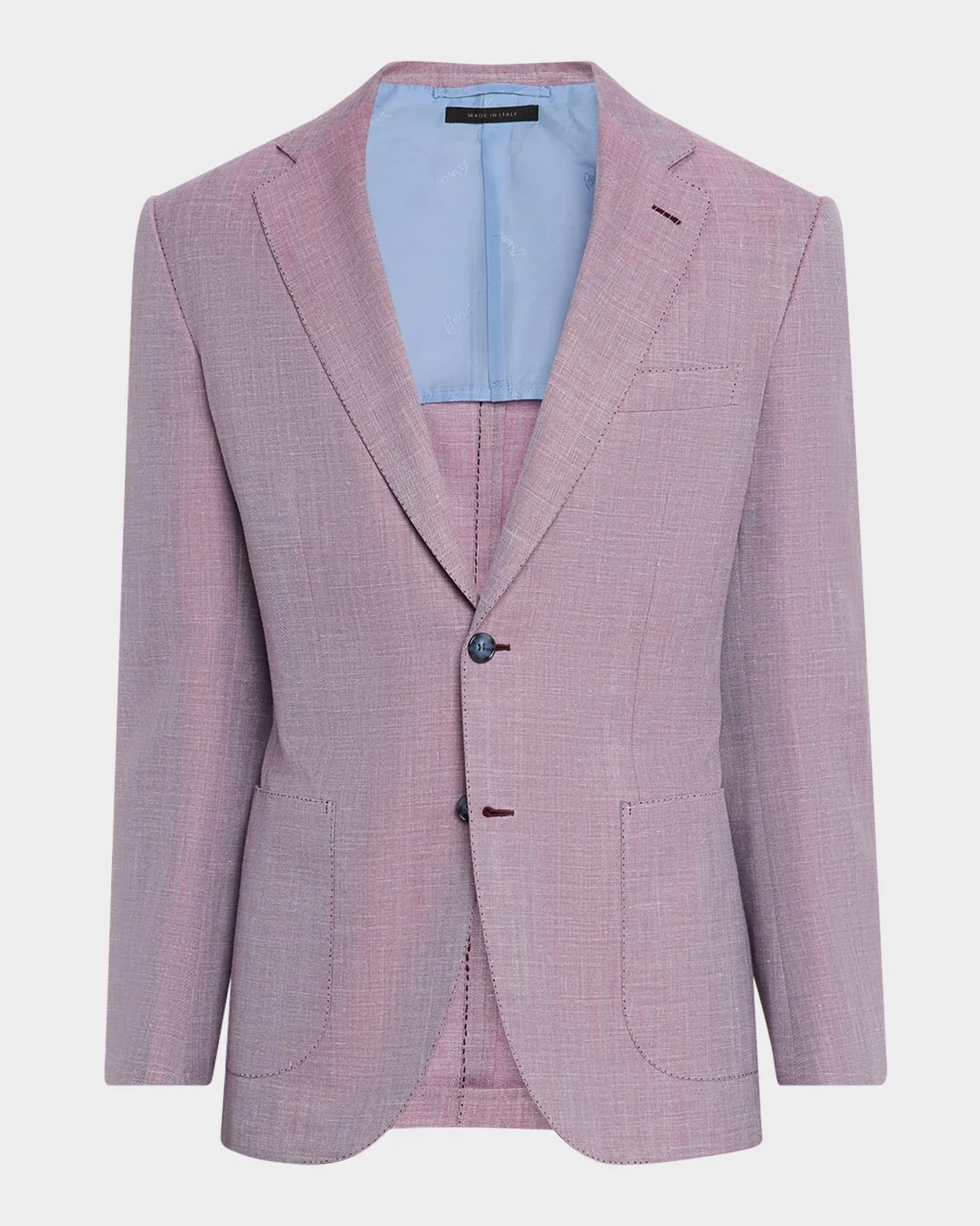 - Brioni blazer in melange herringbone - Notch lapels - Two-button closure - Chest welt pocket - Hip patch pockets - Unfinished sleeves - Double-vented back - Wool/silk/linen - Dry clean - Made in Italy