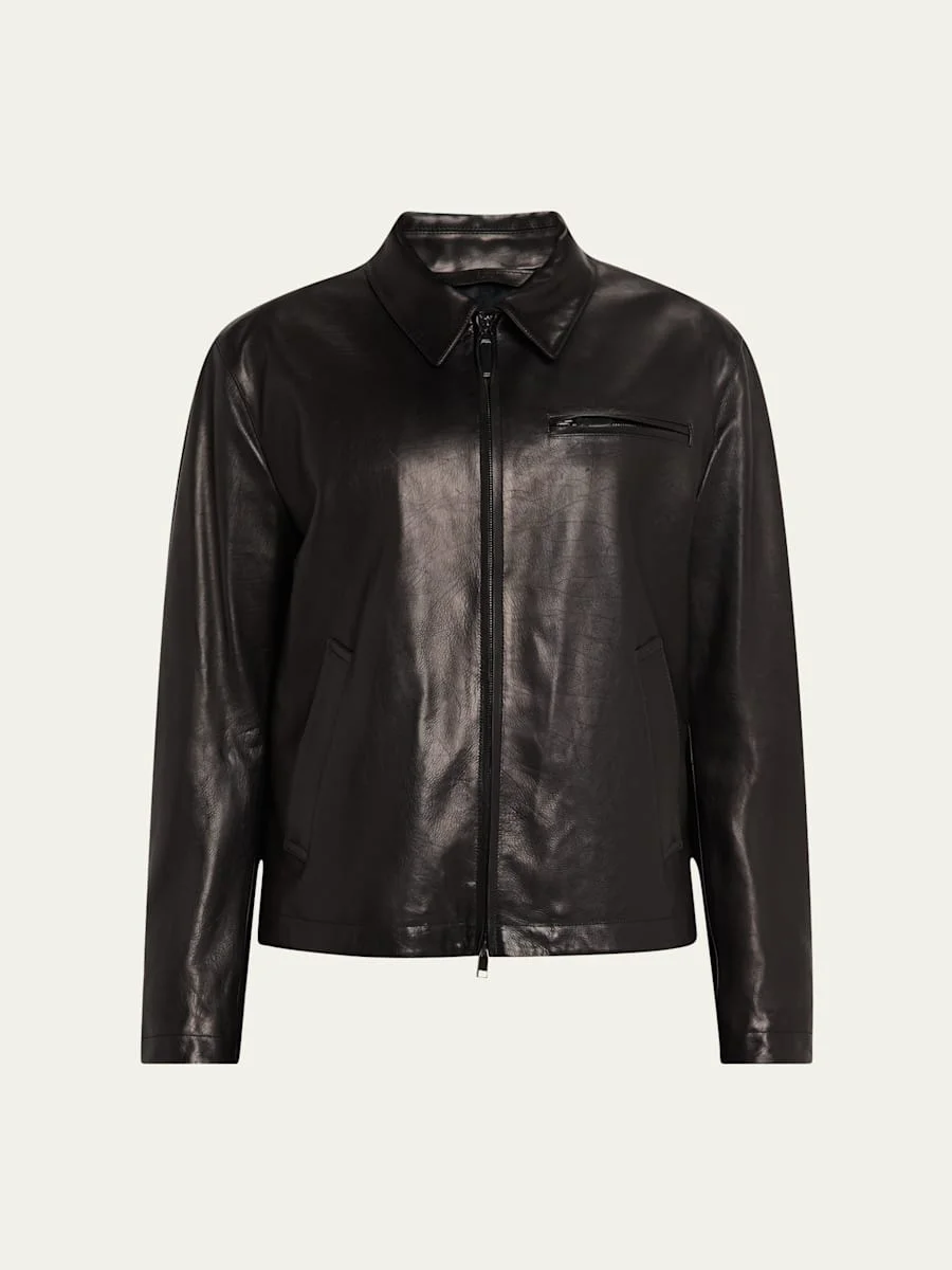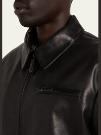 Brioni moto jacket in soft textured calf leather Shirt collar Two-way zip front Chest zip pocket Side welt pockets Long sleeves Zip-up cuffs Side adjusters Leather Made in Italy Online Inquiries: BGS21_NDNRJ| Store Inquiries: #5054086