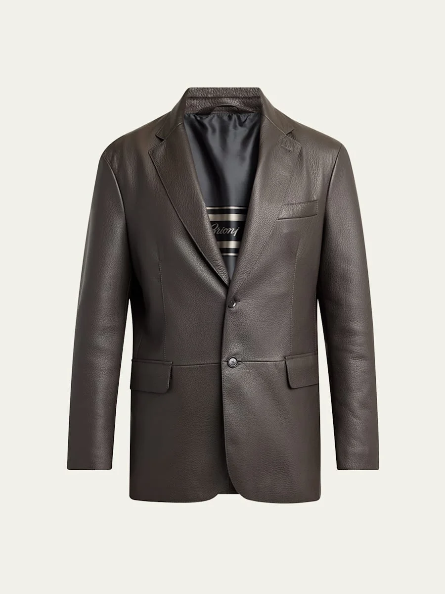 Brioni blazer in soft grained deerskin resulting in a timeless elegance Notched lapels Single-breasted front Chest welt pocket Hip flap pockets Long sleeves Four-button cuffs Double-vented back Leather Made in Italy Online Inquiries: BGS21_NDNRM| Store Inquiries: #5055875