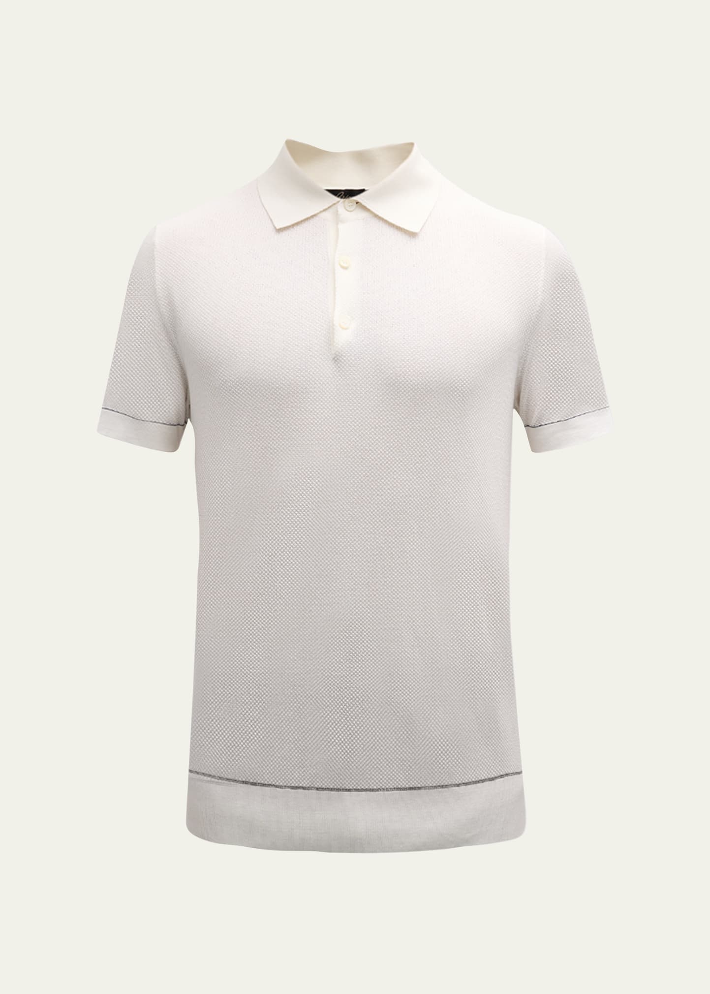 Brioni "Sea Island" polo shirt in textured cotton fabric Spread collar; three-button placket Short sleeves Ribbed cuffs and hem Pullover style Classic fit Made in Italy Model is 6'1"/185cm. Online Inquiries: BGS21_NCWZK| Store Inquiries: #4244985
