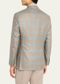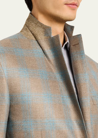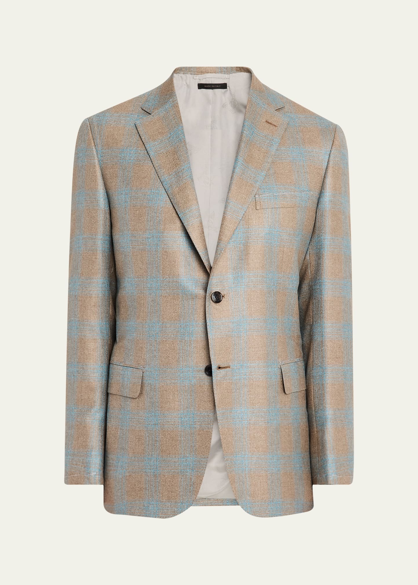 Brioni sport coat in two-tone plaid Notch lapels; buttonhole at left lapel Two-button closure Chest welt pocket Hip flap pockets Unfinished sleeves Double-vented back Silk/cashmere Made in Italy Online Inquiries: BGS21_NCSYH| Store Inquiries: #4945275