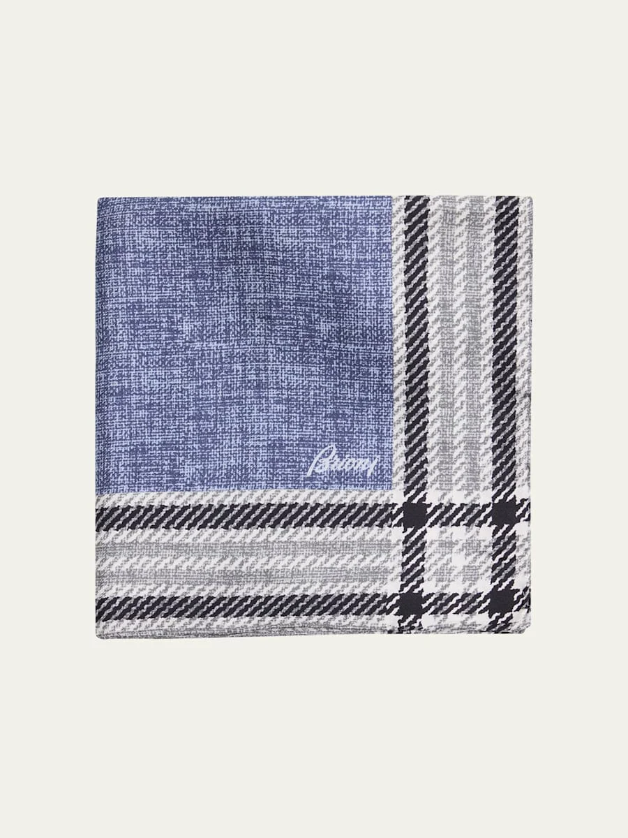 Brioni pocket square in sumptuous silk showcasing printed check trim Approx. 13"L x 13"W Logo signature on the corner Silk Made in Italy Online Inquiries: BGS21_NDNQK| Store Inquiries: #5055806