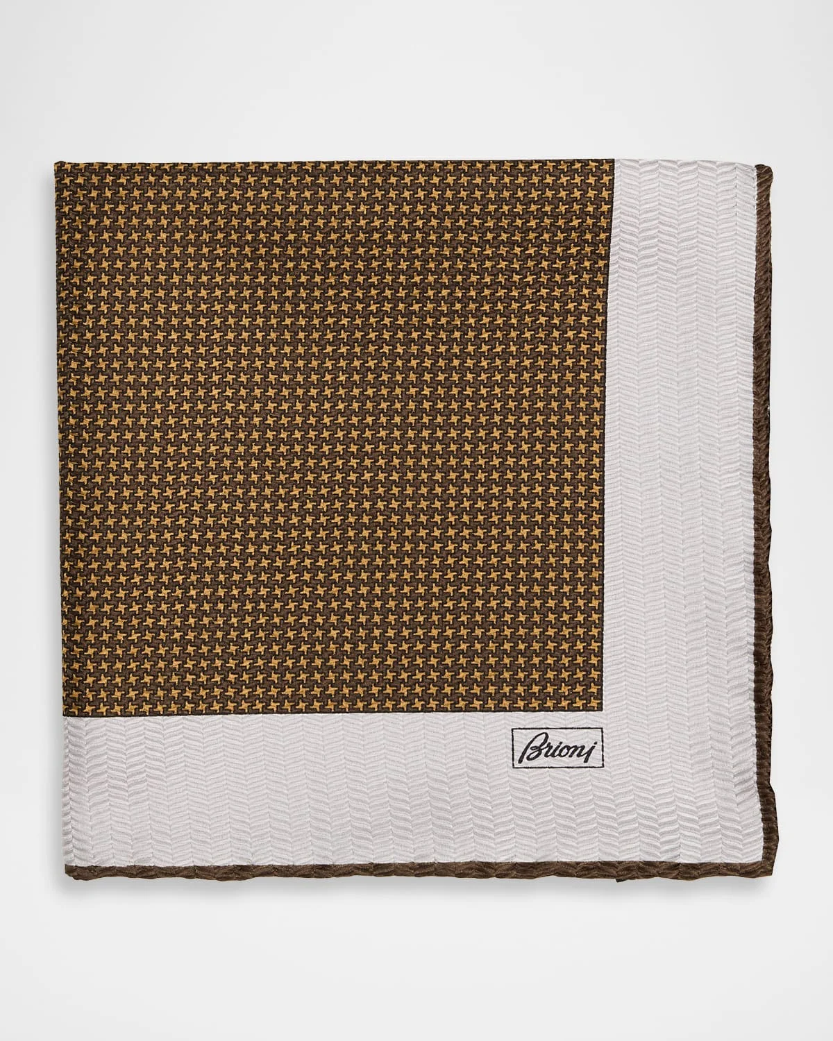 This Brioni pocket square has edges meticulously rolled by hand, creating a soft and flexible trim for a luxurious drape with elegant folds Microgeometric center print Chevron jacquard border Logo signature Silk Dry clean Made in Italy