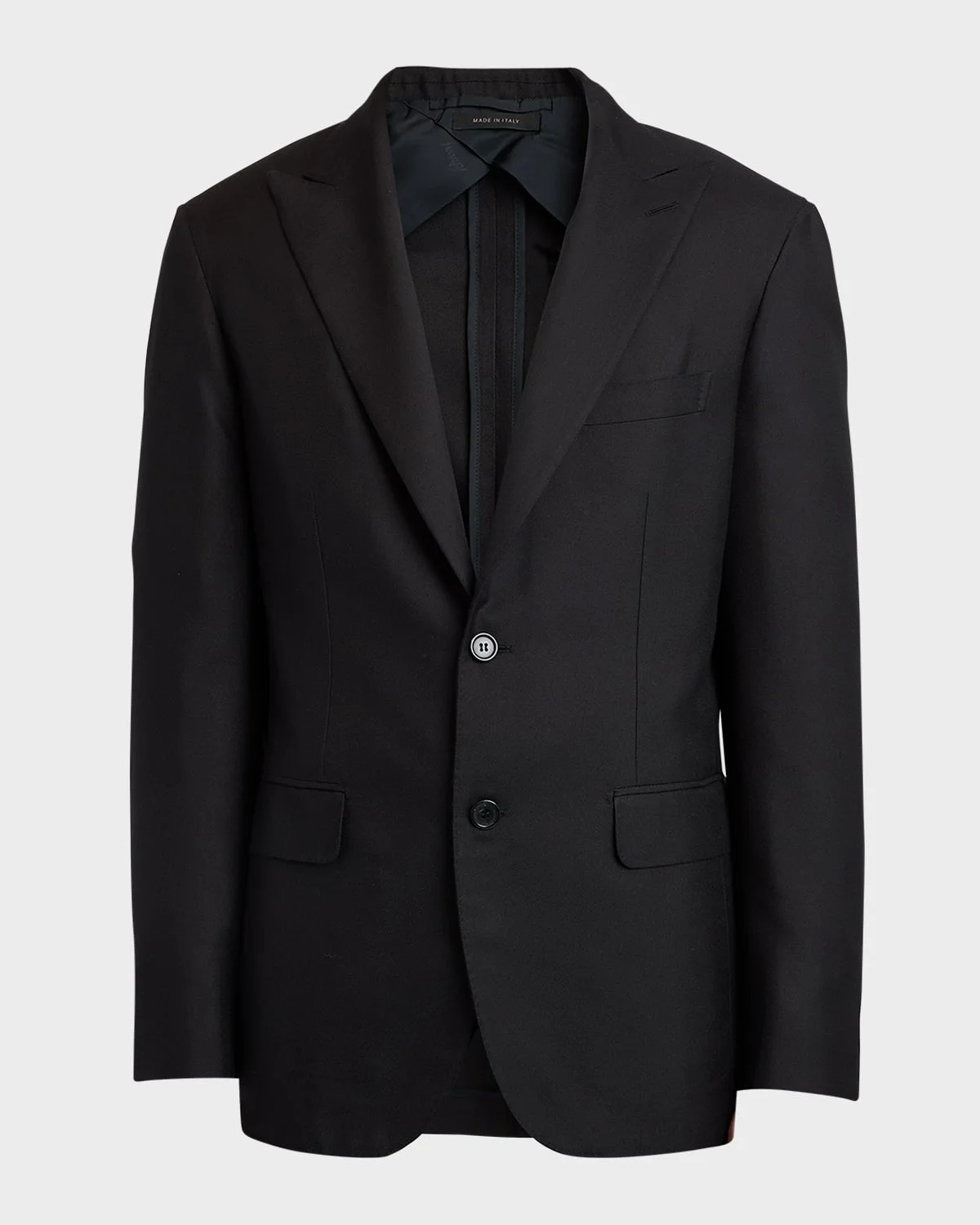 - Brioni blazer crafted of solid silk twill - Peak lapels - Two-button closure - Chest welt pocket - Side flap pockets - Unfinished sleeves - Double-vented back - Dry clean - Made in Italy - Model is 6'1"/185cm.