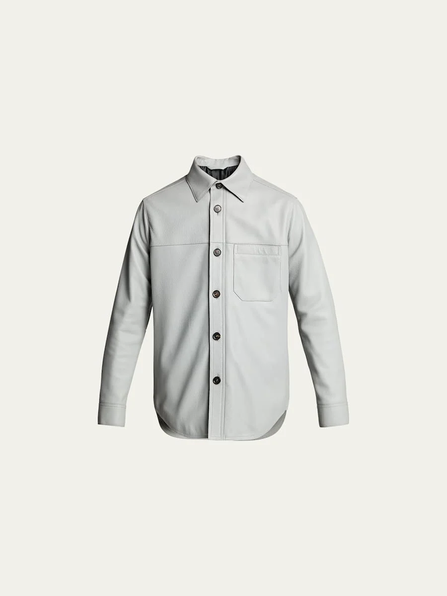 Brioni shirt jacket in solid deerskin leather. Pointed collar; button placket. Patch pocket at chest. Button cuffs. Yoked back shoulders. Curved hem. Made in Italy. Model is 6'1"/185cm. Online Inquiries: BGS21_N81YC| Store Inquiries: #4048580