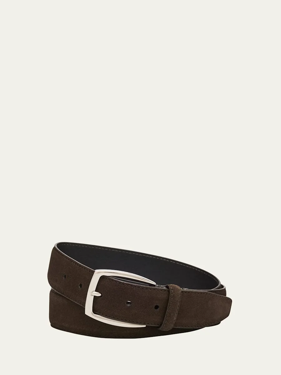 Brioni belt in soft suede defined by a polished square pin buckle Approx. 1.4"W Suede belt loop Adjustable fit Leather Made in Italy