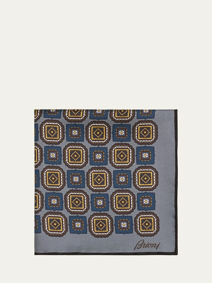 Brioni pocket square in lustrous silk presenting a bold medallion print Approx. 13"L x 13"W Contrast border detailing Logo signature on the corner Silk Made in Italy Online Inquiries: BGS21_NDNQ8| Store Inquiries: #5055794