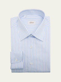 Brioni formal dress shirt in cotton twill with a subtle texture, showcasing a vertical multi-stripe print Point collar Button placket Long sleeves Round barrel cuffs Shirttail hem Cotton Made in Italy Online Inquiries: BGS21_NDNPC| Store Inquiries: #5055753
