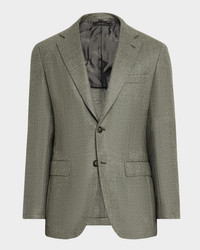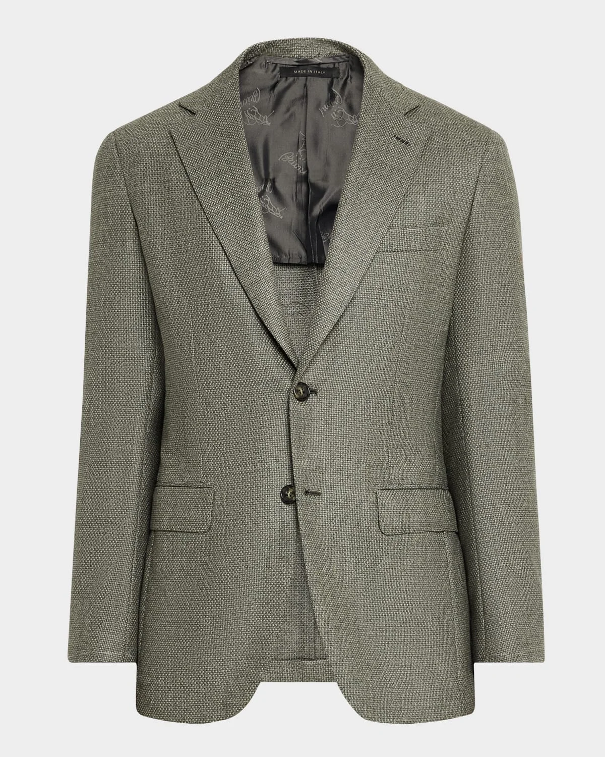 - Brioni blazer with micro basketweave texture - Notch lapels - Two-button closure - Chest welt pocket - Hip flap pockets - Unfinished sleeves - Double-vented back - Wool/cashmere - Dry clean - Made in Italy - Model is 6'1"/185cm.