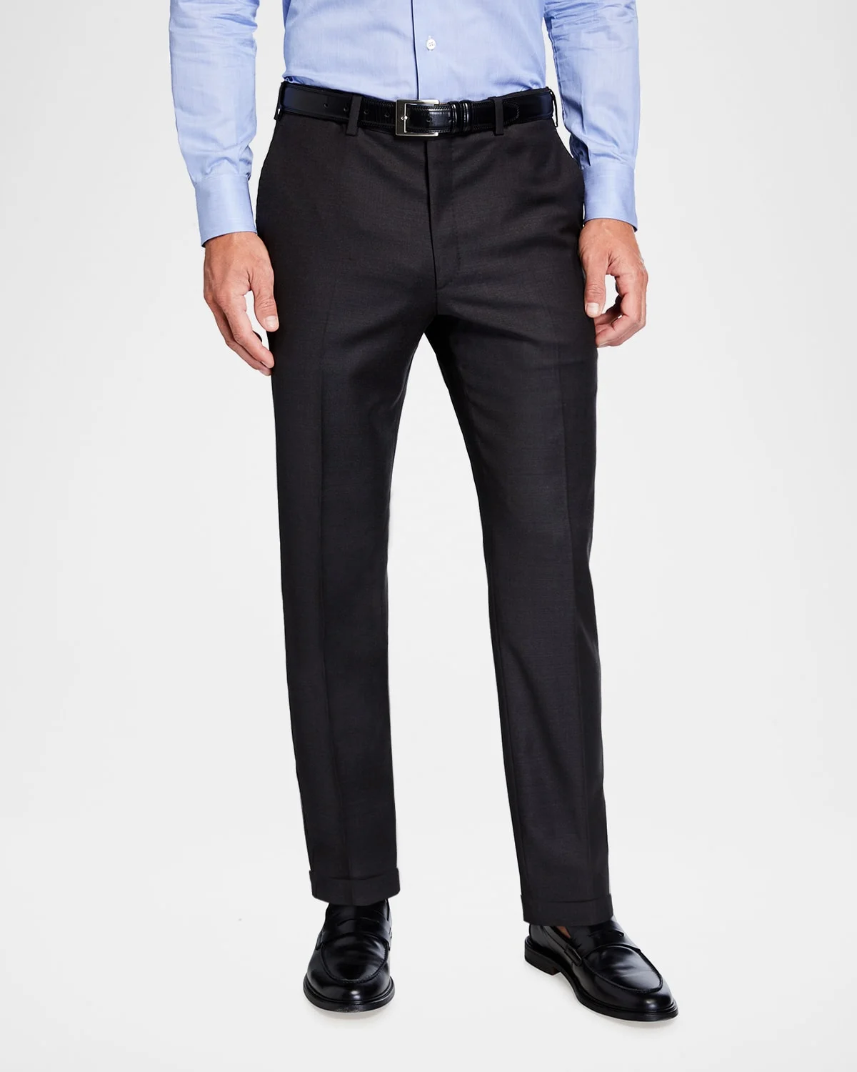 - Brioni "Tigullio" trousers. - Regular rise; belt loops. - Flat front. - Side slash pockets. - Back welt pockets. - Straight legs. - Button closure/zip fly. - Unfinished hem to be tailored to desired length. - Wool. - Made in Italy.