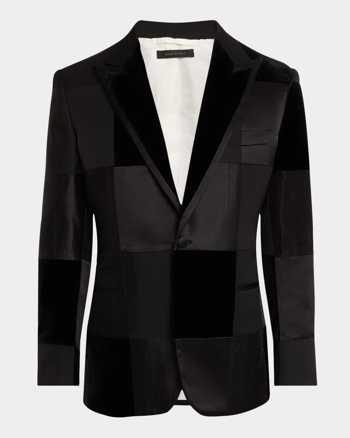- Brioni "Virgilio" patchwork dinner jacket - Peak lapels - Single-button closure - Chest welt pocket - Hip besom pockets - Unfinished sleeves - Double-vented back - Cotton - Dry clean - Made in Italy - Model is 6'1"/185cm.