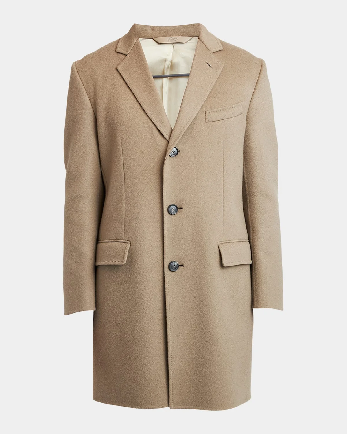- Brioni top coat in double-faced wool and cashmere - Notched lapels - Three-button front - Barchetta chest pocket - Hip flap pockets - Long sleeves - Four-button cuffs - Single-vented back - Wool/cashmere - Dry clean - Made in Italy - Model is 6'1"/185cm.