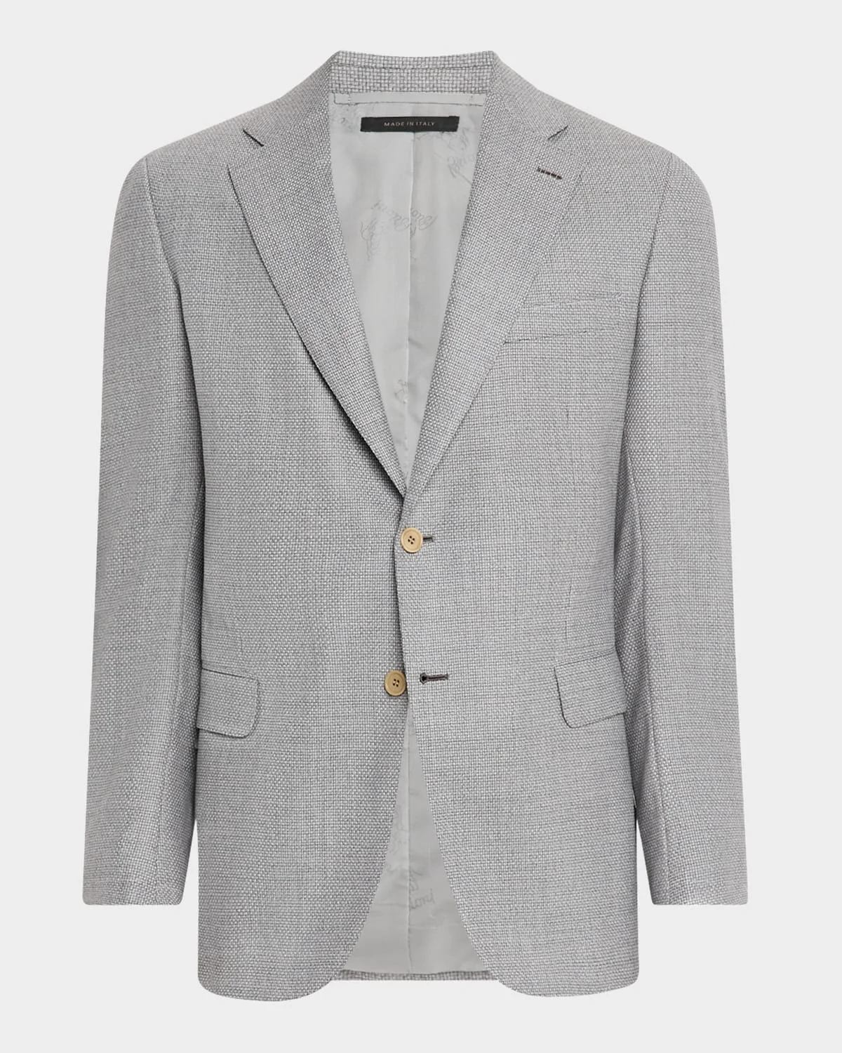- Brioni blazer in premium wool hopsack resulting in a textured finish - Notched lapels - Single-breasted front - Chest welt pocket - Hip flap pockets - Long sleeves - Double-vented back - Tailored fit - Wool - Dry clean - Made in Italy