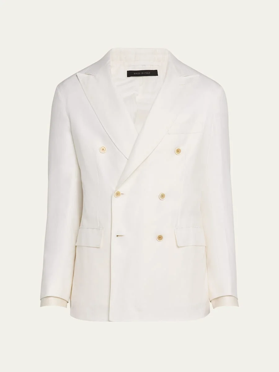 Brioni "Soffio" sport coat from the WWX 80th Anniversary capsule Peak lapels Double-breasted button closure Chest welt pocket Hip flap pockets Unfinished sleeves Double-vented back Silk/cashmere/linen Made in Italy Online Inquiries: BGS21_ND2XN| Store Inquiries: #5009822