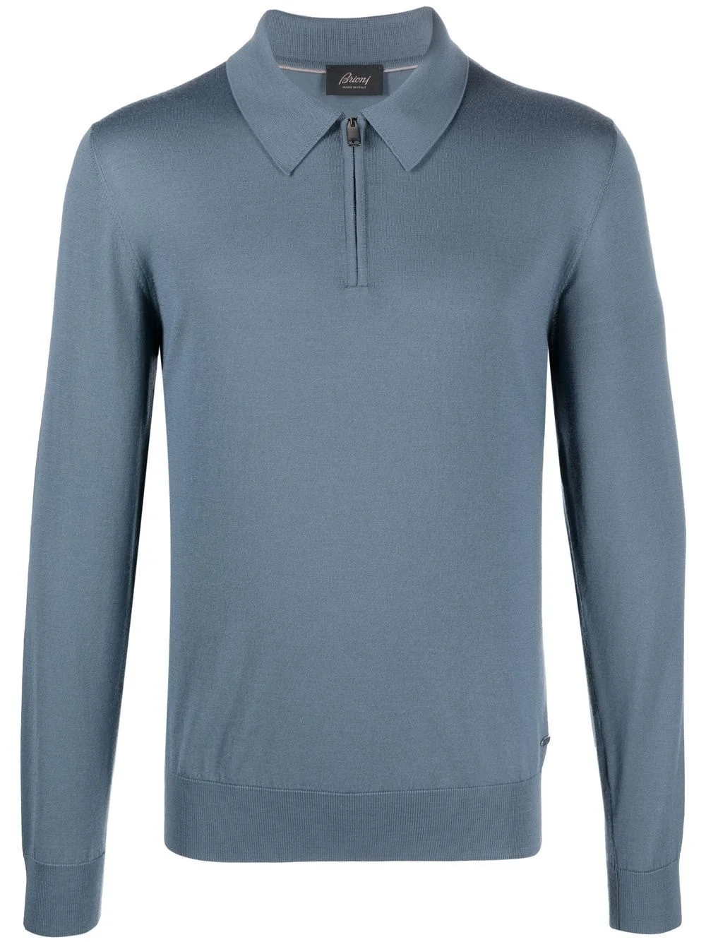 polo-collar wool jumper wool powder blue polo collar logo plaque short front zip fastening long sleeves straight hem Made in Italy Composition Wool 100% SIZE & FIT Model measurements Height 6 ft 0 in(1.84 m) Bust/Chest 35.82 in(91 cm) Hips 37 in(94 cm) Waist 28.34 in(72 cm) FittingInformation This piece fits true to size. We recommend you get your regular size Cut for a relaxed fit Made with a mid-weight fabric Washing instructions Hand Wash