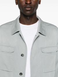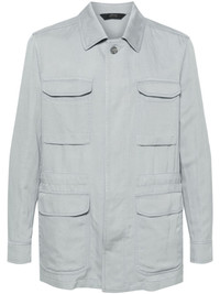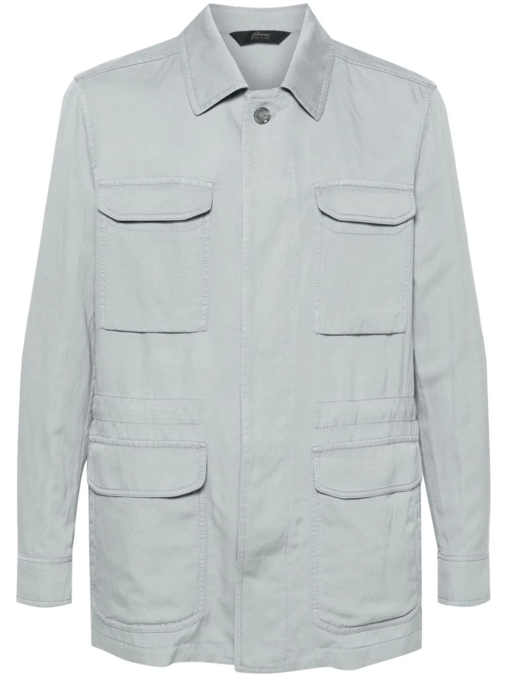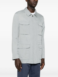 Sahariana shirt jacket Highlights - Aqua blue - Silk-linen blend - Gabardine weave - Tonal stitching - Classic collar - Concealed front button fastening - Internal drawstring fastening waist - Long sleeves - Buttoned cuffs - Four front flap pockets - Straight hem Made in Italy Composition Outer: Silk 62%, Linen/Flax 38% Lining: Cupro 100%, Cotton 100% SIZE & FIT Model measurements Height 6 ft 2 in(1.87 m) Bust/Chest 36.41 in(92.5 cm) Hips 37 in(94 cm) Waist 29.52 in(75 cm) FittingInformation Designed for a relaxed fit, this piece allows for comfort and movement when worn The adjustable drawstring means that you can adjust this piece’s fit to suit your comfort and preference Made from a midweight non-stretch fabric This piece fits true to size – take your usual size