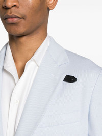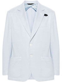 single-breasted silk blend blazer Highlights - Sky blue - Silk blend - Notched lapels - Front button fastening - Long sleeves - Buttoned cuffs - Chest welt pocket - Two front patch pockets - Internal jetted pocket - English rear vents - Straight hem - Unlined Made in Italy Composition Outer: Calf Leather 100%, Silk 65%, Cotton 35% Lining: Cupro 100% SIZE & FIT Model measurements Height 6 ft 2 in(1.87 m) Bust/Chest 36.22 in(92 cm) Hips 37 in(94 cm) Waist 27.95 in(71 cm) FittingInformation Designed for a regular fit, allowing for a comfortably loose fit throughout the body The vented hem offers movement at the rear Made from a midweight non-stretch fabric This piece fits true to size – take your usual size