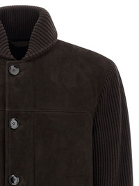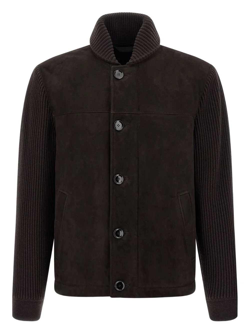 ribbed-sleeve suede bomber jacket Highlights - Brown - Suede leather - Ribbed knit sleeves - Button fastening - Shawl collar - Welt pockets Made in Italy Composition Outer: Lamb Skin 100%, Wool 50%, Cashmere 50% Lining: Polyester 100% Washing instructions Read Manufacturer Guidelines