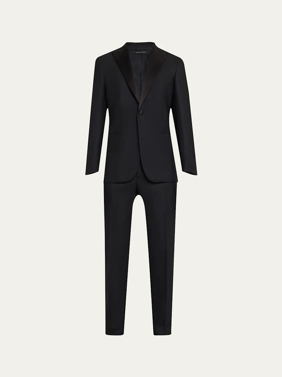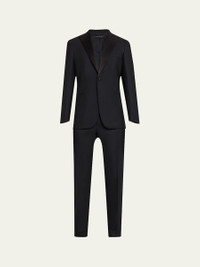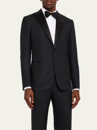 Brioni solid tuxedo with satin lapels Peaked lapels; single-button front Chest and side welt pockets Long sleeves; four-button cuffs Regular-rise trousers Full length with creasing Button/zip fly; belt loops Unfinished hem to be tailored to desired length Wool Made in Italy Model is 6'1"/185cm. Online Inquiries: BGS21_N760Q| Store Inquiries: #3257734