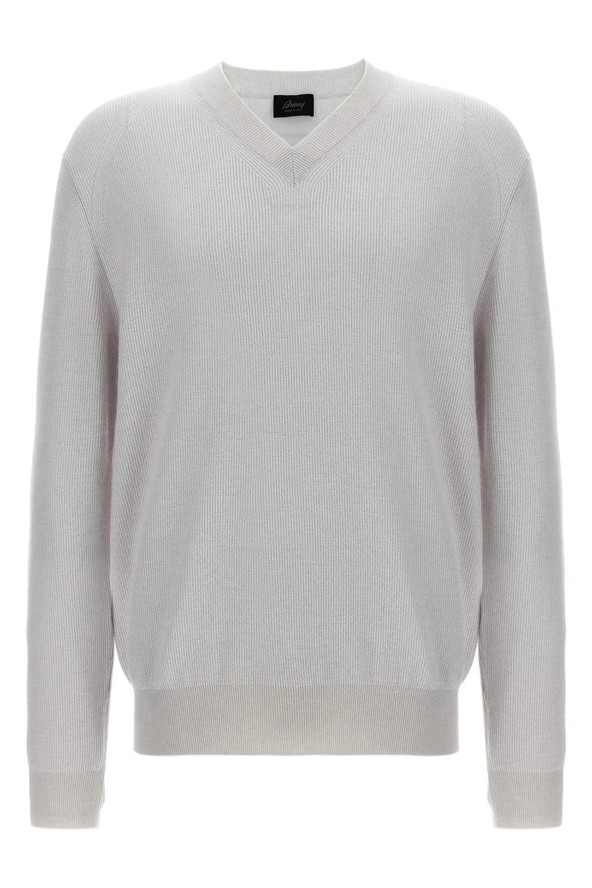 cod. UMQ70LOCK129190 Ribbed cashmere and wool sweater with V-neck, long cuffed sleeves. Color: White Size & Fit: true to size fit Composition: 64% cashmere 36% wool Made in: Italy