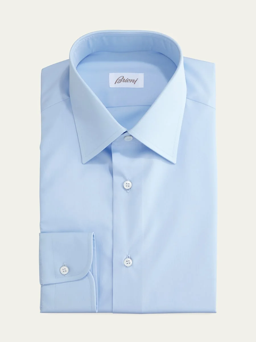 Brioni Wardrobe Essential dress shirt. Point collar; French-placket button front. Rounded barrel cuffs. Shirttail hem. Cotton. Dry clean. Handmade in Italy. Model is 6'1"/185cm. Online Inquiries: BGS21_N4L0C| Store Inquiries: #2035391