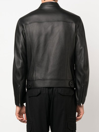 ZIP-FRONT LEATHER JACKET FROM BRIONI FEATURING OLIVE BLACK, BAND COLLAR, LONG SLEEVES, CUFF ZIPS, FRONT TWO-WAY ZIP FASTENING AND TWO SIDE ZIP-FASTENING POCKETS.