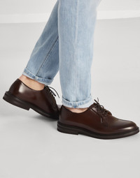 The excellence of Brunello Cucinelli materials enhances the new Derby, an elegant and timeless men's style. The upper is crafted in aged calfskin, characterized by a subtly glossy yet vintage look. A leather lining provides refined comfort whilst a decorative welt with matching stitching is paired with a leather and lightweight foam bottom. MATERIALS Aged calfskin is a refined leather with a smooth and semi-polished appearance. Manufacturing involves a final hand-brushing process that enriches the surface with slight color shading and a “worn” effect that tends to evolve with regular use. A leather lining and a leather bottom with rubber tread complete the footwear. DETAILS Round waxed fabric laces Extra waxed fabric laces Leather lining Sole in leather and lightweight expanded polyurethane REAL LEATHER