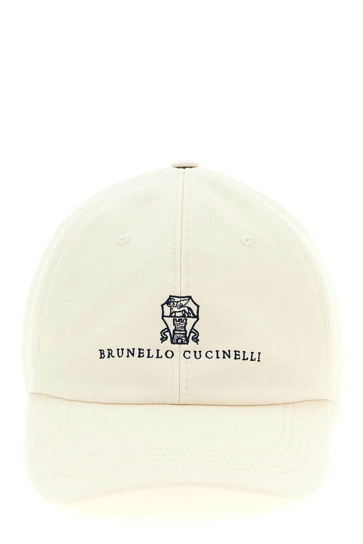 cod. M252D9850CIY08 Garment-dyed twisted cotton gabardine hat, 'Baseball' model, embroidered Solomeo heraldic coat of arms logo on the front, adjustable leather strap at the back. Color: Beige Size & Fit: true to size fit Composition: 100% cotton Made in: Italy
