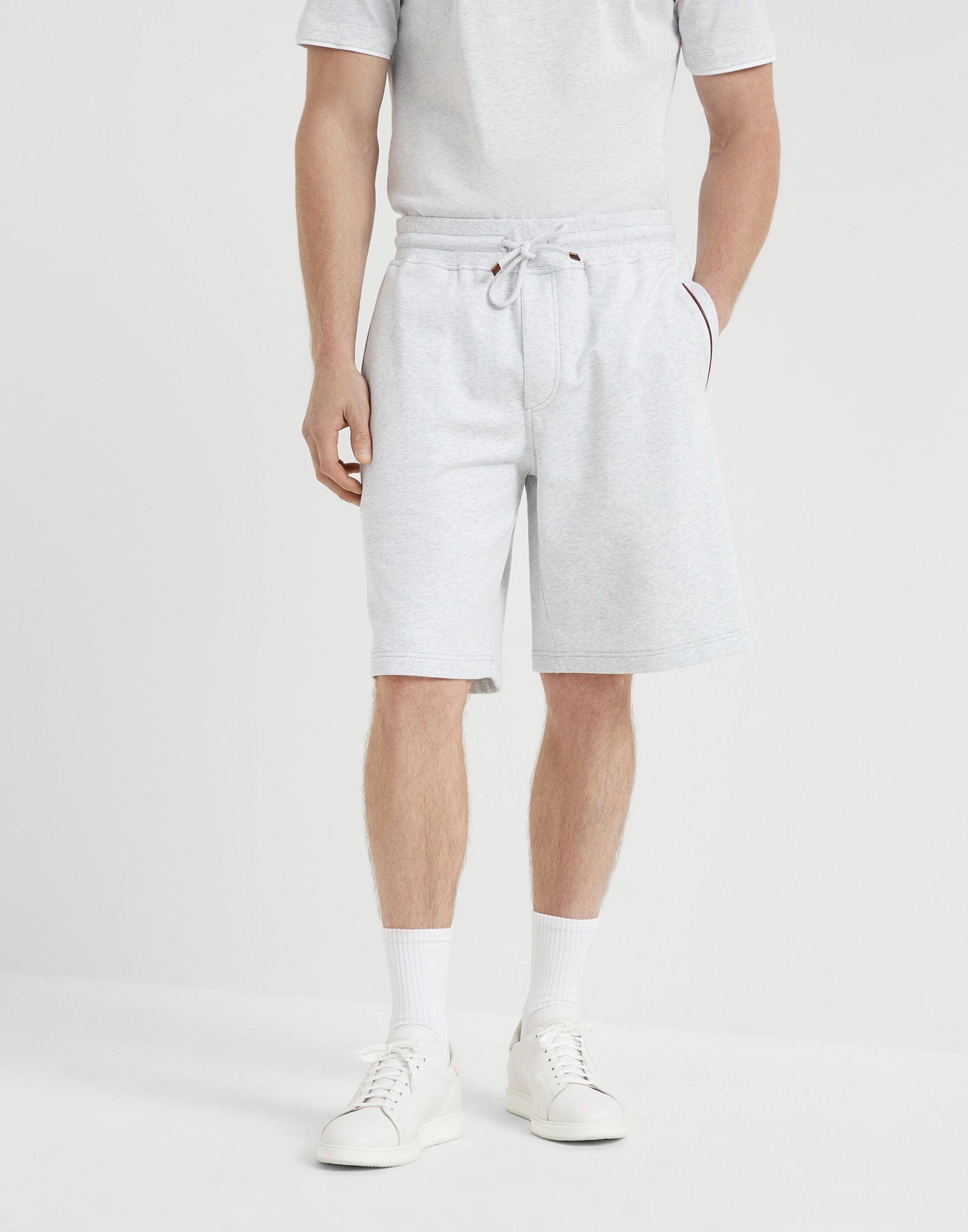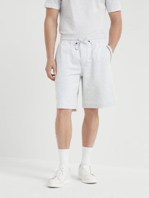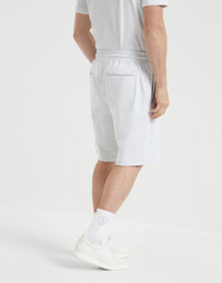 Refined materials enrich the sporty style of the Travelwear line, dedicated to moments of relaxation and leisure. Showcasing soft, relaxed lines, these knee length drawstring Bermuda shorts are delivered in techno cotton French terry and are enriched by its distinctive texture contrast: smooth and compact on the outside and soft on the inside against the skin. The garment is characterized by the edging detail along the entire silhouette, paired with a comfortable fit. MATERIALS Techno cotton French terry is a soft and lightweight fabric: the exterior texture is smooth and compact, while the interior offers a honeycomb structure which helps to make it comfortable when worn. A small percentage of synthetic fiber provides added comfort. DETAILS Rib knit waistband with drawstring Vertical front pockets Back welt pockets with button 95% COTTON, 5% NYLON