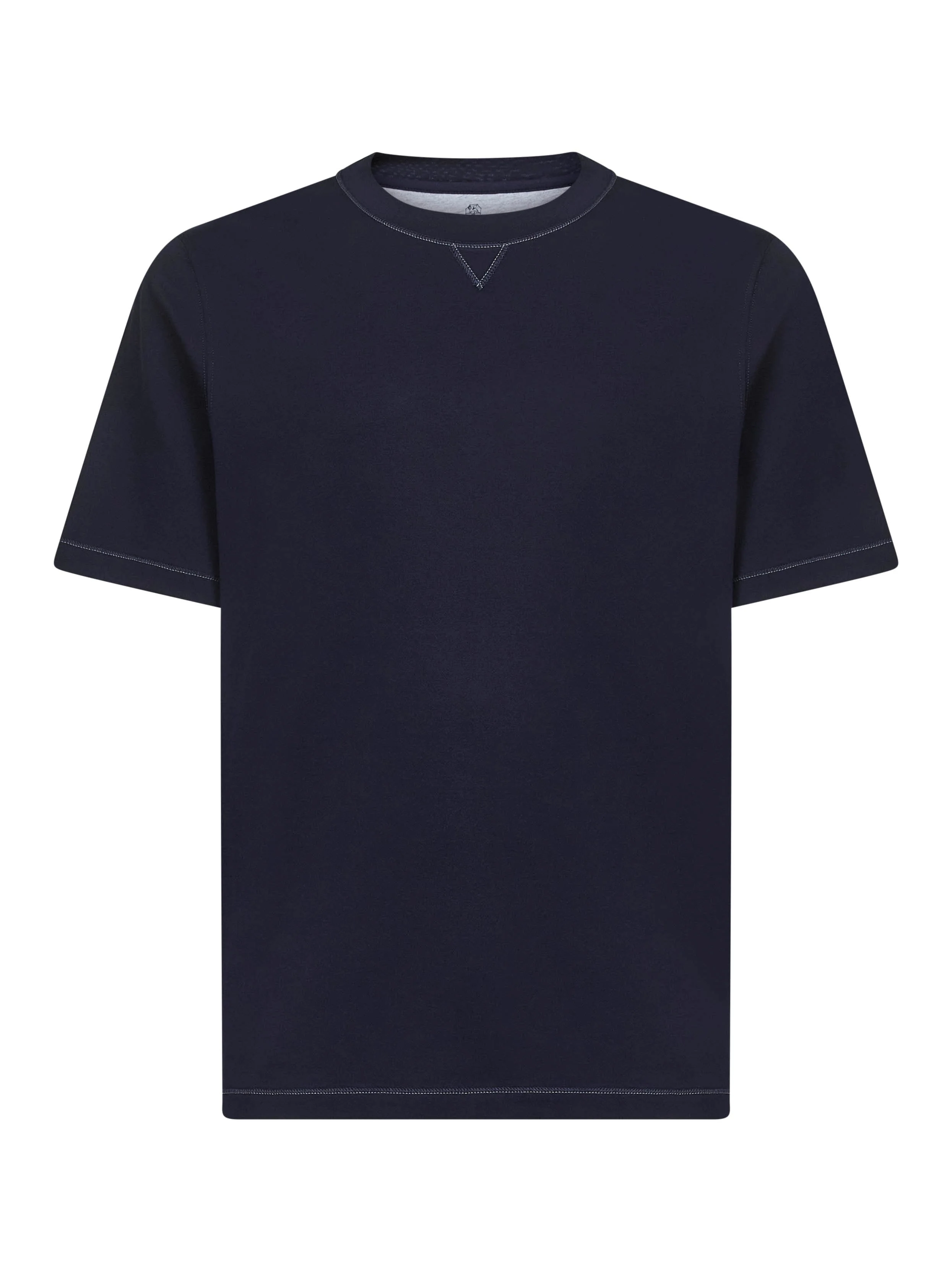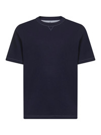 - Ribbed crewneck with triangle detail - Short sleeves with flat pressed hem - Contrasting solomeo crest embroidery at chest - Flat pressed hem - Cotton jersey design - Regular fit - Blue color - 100% cotton - Made in italy Natural (Veg): Cotton100 % Made in: ITALIA Season: A25 M0B131328G-CW369