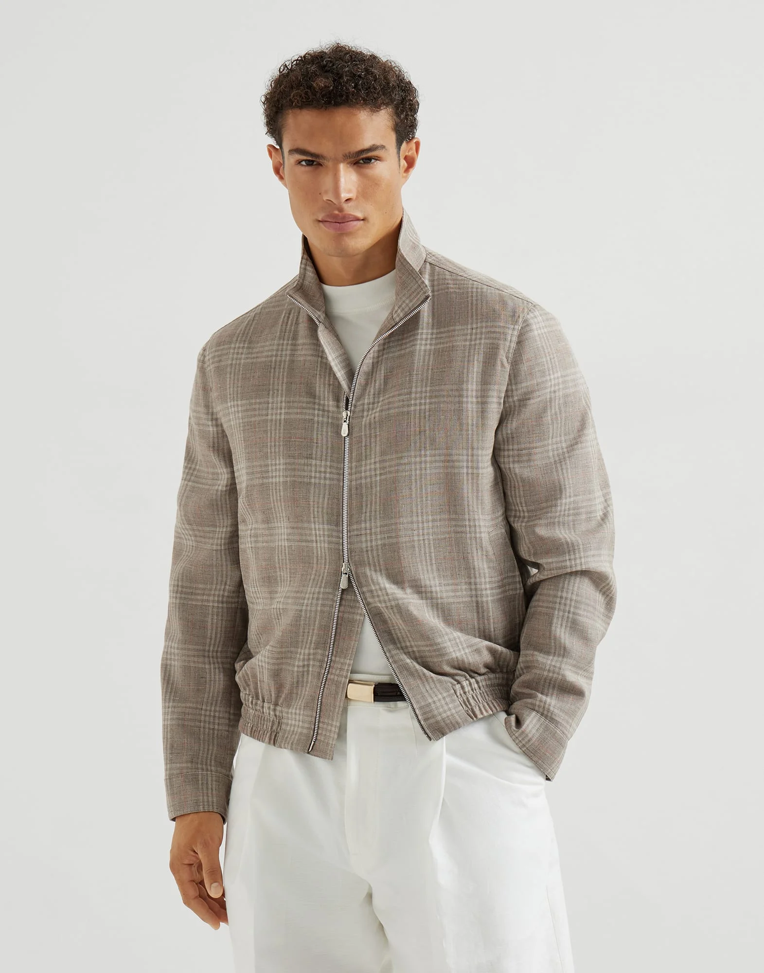 A casual attitude is paired with the traditional codes of tailoring within a contemporary vision of menswear. This bomber-style outerwear jacket, with a zipper closure and stand collar, is delivered in a refined wool, silk and linen tartan, a light, compact fabric with a distinctive, irregular slubbed effect. The fit offers regular proportions, slightly shorter and roomier at the bottom. MATERIALS The lightweight wool, silk and linen fabric is crafted to create the classic tartan pattern in the season’s colors. The material combines the natural properties of different yarns, resulting in a crisp, glossy fabric with a compact texture enriched by a characteristic slubbed appearance that creates irregular color effects. The cupro lining provides added comfort. DETAILS Two-way zip closure Stand-up collar Snaps at cuffs Hand pockets with snap Cupro half lining Two interior pockets with button closure and pen holder Elasticized hem 65% WOOL, 20% SILK, 15% LINEN